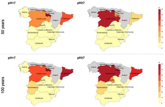 Percentage of total plots that, after applying sewage sludge for 50 and 100 years, exceeded at least one heavy metal concentration limit with pH < 7 and pH ≥ 7. Grey regions (namely Asturias, Cantabria, Pais Vasco, Navarra, Aragon, Balearic Islands, Ceuta, Melilla and Canary Islands) did not register sludge application.
