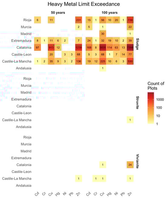 In a first step we estimated the potential heavy metal accumulation resulting from scenarios involving the application of four P fertilisers in Spanish agriculture: sewage sludge, struvite, vivianite, and CaP, over 50- and 100-year periods. Simulation periods of 50 and 100 years were selected to represent medium- and long-term management horizons commonly used in soil contamination and nutrient balance studies [,]. The 50-year horizon approximates the typical timescale of agricultural soil use under consistent management, whereas the 100-year period enables assessment of potential legacy effects from slow-accumulating heavy metals.