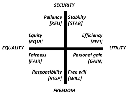 The proposed legal value system (Lomfeld [4]), see Figure 2, is consistent with many existing taxonomies of antagonistic psychological (Rokeach [42], Schwartz [43]), political (Eysenck [44], Mitchell [45]), and economic values (Clark [46])2. In all social orders, one can observe a general antinomy between individual and collective values. Ideal types of this fundamental normative dialectic are the basic value of FREEDOM for the individual, and the basic value of SECURITY for the collective perspective. Another classic social value antinomy is between a functional–economic (utilitarian) and a more idealistic (egalitarian) viewpoint, represented in the ethical debate by the essential dialectic concerning the basic values of UTILITY versus EQUALITY. These four normative poles stretch two axes of value coordinates for the general value system construction. We thus speak of a normative dialectics since each of the antagonistic basic values and related principles can (and in most situations will) collide with each other.