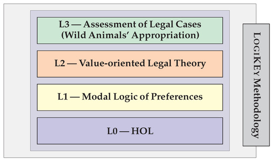The LogiKEy methodology, cf. Figure 1, has been instantiated in this article to support and guide the simultaneous development of the different modelling layers as depicted in Figure 3, which will be the subject of discussion in the following sections. According to the logico-pluralistic nature of LogiKEy, only the lowest layer (L0), meta-logic HOL (cf. Section 4), remains fixed, while all other layers are subject to dynamic adjustments until a satisfying overall solution in the overall modelling process is reached. At the next layer (L1), we are faced with the choice of an object logic, in our case, a modal logic of preference (cf. Section 5). A legal DSL (cf. Section 6), created after discoursive grammar (cf. Section 2), further extends this object logic at a higher level of abstraction (layer L2). At the upper layer (layer L3), we use this legal DSL to encode and automatically assess some example legal cases (“wild animal cases”) in property law (cf. Section 7) by relying upon previously encoded background legal and world knowledge.4 The higher layers thus make use of the concepts introduced at the lower layers. Moreover, at each layer, the encoding efforts are guided by selected tests and ‘sanity checks’ in order to formally verify relevant properties of the encodings at and up to that level.