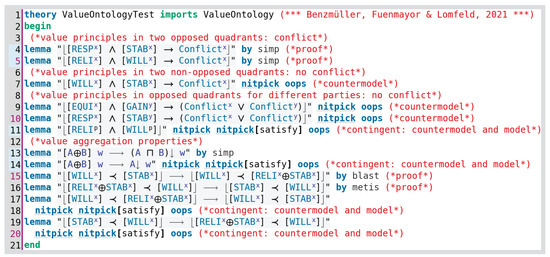 - Benzmüller, C.; Fuenmayor, D. Value-oriented Legal Argumentation in Isabelle/HOL. In International Conference on Interactive Theorem Proving (ITP), Proceedings; LIPIcs; Cohen, L., Kaliszyk, C., Eds.; Schloss Dagstuhl-Leibniz-Zentrum für Informatik: Wadern, Germany, 2021; Volume 193, pp. 23:1–23:18. [Google Scholar] [CrossRef]