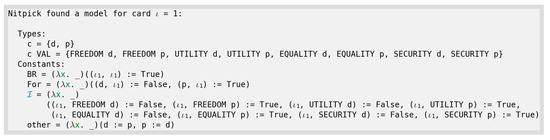 - Blanchette, J.C.; Nipkow, T. Nitpick: A Counterexample Generator for Higher-Order Logic Based on a Relational Model Finder. In Interactive Theorem Proving, Proceedings of the First International Conference, ITP 2010, Edinburgh, UK, 11–14 July 2010; LNCS; Kaufmann, M., Paulson, L.C., Eds.; Springer: Berlin/Heidelberg, Germany, 2010; Volume 6172, pp. 131–146. [Google Scholar]