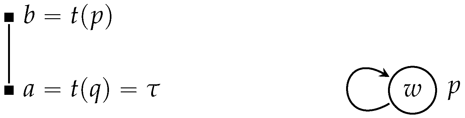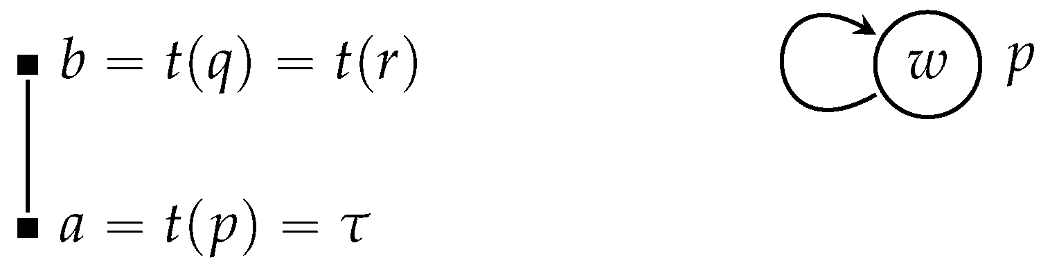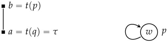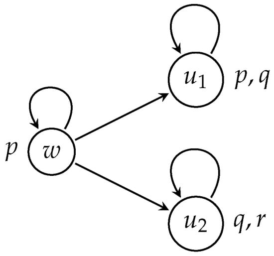 Consider the formula . Assume that for all worlds u such that , we have but ; that is, p is true and q is false in every world accessible from w. Moreover, suppose that while , meaning the topic of q is grasped, whereas the topic of p is not. An example of a model satisfying these conditions is , depicted in Figure 2, where , , , with and such that , and . It follows that , but this result is problematic. There is no appropriate connection between truth and topic-grasping. The truth of the disjunction at all accessible worlds from w depends solely on the truth of p in those worlds. Yet the agent grasps only the topic of q, not that of p. The grasped topic is irrelevant, since the truth of hinges entirely on the topic the agent fails to grasp.