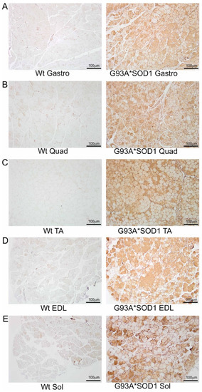 IHC staining of human mutant-SOD1 protein in the muscles of G93A*SOD1 mice. Representative IHC stained images showing the human mutant-SOD1 protein (brown) in the muscle cross-sections of Wt and G93A*SOD1 mice. (A) Gastrocnemius (Gastro), (B) Quadriceps (Quad), (C) Tibialis Anterior (TA), (D) Extensor digitorum longus (EDL), and (E) Soleus (Sol) muscle. Hematoxylin (blue) was used to counterstain the nuclei. (n = 4 mice/group). Scale bars: 100 µm. Wt = Wildtype.