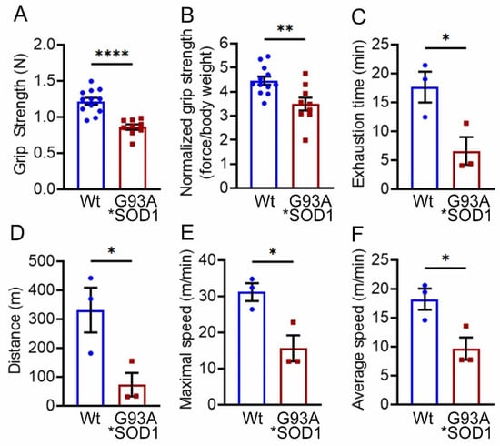 Skeletal muscle functional assessment in the mice was performed by grip strength measurement and graded maximal exercise testing. Measurements of absolute forelimb grip strength (Figure 3A) and forelimb grip strength normalized to body weight (Figure 3B) showed reduced physical endurance in G93A*SOD1 mice compared to Wt mice. We also performed an exercise tolerance test using a forced treadmill running. Interestingly, G93A*SOD1 mice showed compromised exercise capacity to run on a treadmill compared to Wt mice, indicated by exercise tolerance test parameters including reduced exhaustion time (Figure 3C), maximum distance run (Figure 3D), maximal speed (Figure 3E), and average speed (Figure 3F). Overall, G93A*SOD1 mice showed reduced endurance and tolerance to exercise.