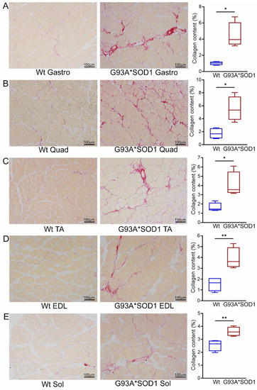 Several studies using animal models and human samples suggest fibrotic remodeling occurs in different organs in ALS [19]. However, histopathological characterization of the skeletal muscles of mouse models of ALS is scarce and remains understudied. Therefore, we evaluated fibrotic remodeling in the skeletal muscles (Gastro, Quad, TA, Sol, and EDL muscles) isolated from Wt and G93A*SOD1 mice using Picro-Sirius Red (PSR) staining (Figure 4A–E). All five skeletal muscles from G93A*SOD1 mice exhibited significantly increased interstitial and perivascular collagen deposition compared to Wt mice. Therefore, the fibrotic remodeling of the muscles accompanied skeletal muscle atrophy in the G93A*SOD1 mice.