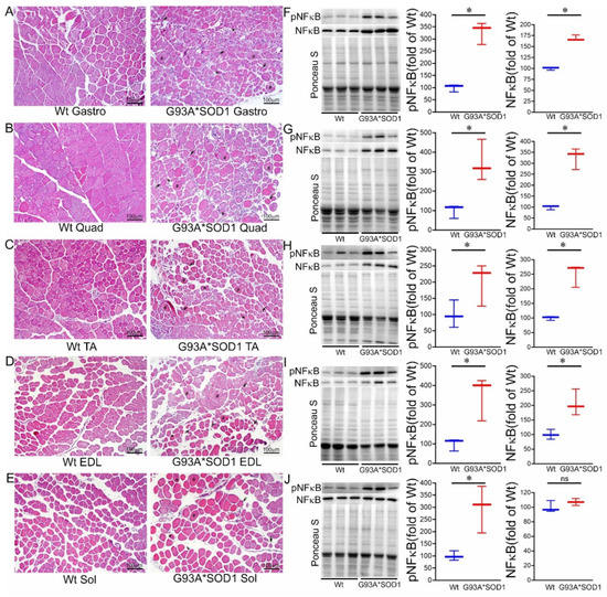 H&E staining of skeletal muscle sections of Wt and G93A*SOD1 mice. Representative images of H&E stained cross-sections muscle sections of (A) Gastrocnemius (Gastro), (B) Quadriceps (Quad), (C) Tibialis Anterior (TA), (D) Extensor digitorum longus (EDL), and (E) Soleus (Sol) muscle. G93A*SOD1 mice muscles exhibit myopathic changes indicated by markedly increased variation in fiber size, including hypertrophic fibers (#), atrophic fibers (*), and endomysial fibrosis (black arrows) compared to Wt mice muscle sections (n = 4 mice/group). Scale bars: 100 µm. (F–J) Representative Western blot images and densitometric quantification showing pNFκB and NFκB protein levels in Gastro, Quad, TA, EDL, and Sol muscles. Ponceau S staining of the transfer membranes was used to confirm the approximately equal loading and transfer across the gel. Box plots showing the protein levels of pNFκB and NFκB in Gastro, Quad, TA, EDL, and Sol muscles (n = 3 mice/group). Boxes represent interquartile ranges, lines represent medians, and whiskers represent ranges. p < 0.05 between groups was considered statistically significant and was determined by the non-parametric Kruskal–Wallis test. * p < 0.05, ns = non-significant. Wt = Wildtype.