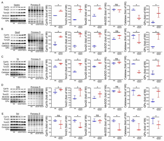 Altered levels of mitochondrial transport proteins and antioxidant enzymes proteins in G93A*SOD1 muscles. Representative Western blot images and densitometric quantification showing Tom 20, Tim 23, Cpt1b, MnSOD, Catalase, and GPx protein level in (A) Gastrocnemius (Gastro), (B) Quadriceps (Quad), (C) Tibialis Anterior (TA), (D) Extensor digitorum longus (EDL), and (E) Soleus (Sol) muscles (Wt and G93A*SOD1 mice). Ponceau S staining of the transfer membranes was used to confirm the approximately equal loading and transfer across the gel (n = 3 mice/group). Box plots showing the protein levels, boxes representing interquartile ranges, lines representing medians, and whiskers representing ranges. p < 0.05 between groups was considered statistically significant and was determined by the non-parametric Kruskal–Wallis test. * p < 0.05, ns = non-significant. Wt = Wildtype.