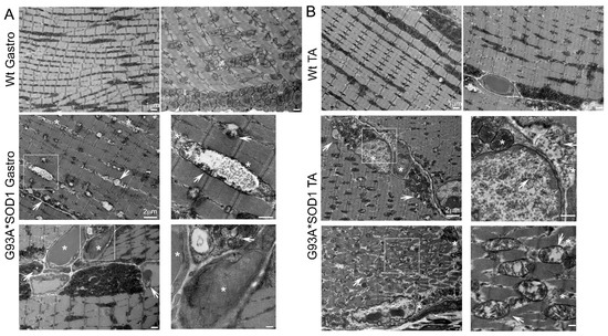 Several studies proposed mitochondrial dysfunction as a contributing factor to ALS pathology. Studies demonstrating the pathology associated with mutant SOD1 also showed mutant SOD1 protein enrichment only in the mitochondria of affected tissues (specifically the spinal cord) of human, mouse, and rat models of ALS [28,29,30]. In addition, biochemical experiments using isolated mitochondria also reported a significant proportion of mutant SOD1 localization in the mitochondrial intermembrane space isolated from both the brain and liver of G93A*SOD1 mouse [30], yeast [31] and rat liver [32]. Therefore, we performed TEM analysis of the Gastro and TA muscle of the G93A*SOD1 and Wt mice to assess the ultrastructural changes associated with mutant-SOD1 expression in the muscle. We observed the accumulation of vacuolated, dilated, and disorganized mitochondria in the skeletal muscle of mutant-SOD1 mice (Figure 8A,B).