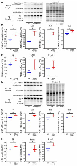 Ultrastructural analysis of the muscle also showed the presence of granulofilamentous material and electron-dense granular deposits in the subsarcolemmal region. We also measured the OXPHOS and PDH complex regulatory protein levels in Gastro and TA muscle isolated from G93A*SOD1 and Wt mice. Both the Gastro (Figure 9A–C) and TA (Figure 9D–F) muscles showed increased OXPHOS and PDH complex regulatory protein levels in G93A*SOD1 mice compared to Wt mice (Figure 9A,D).