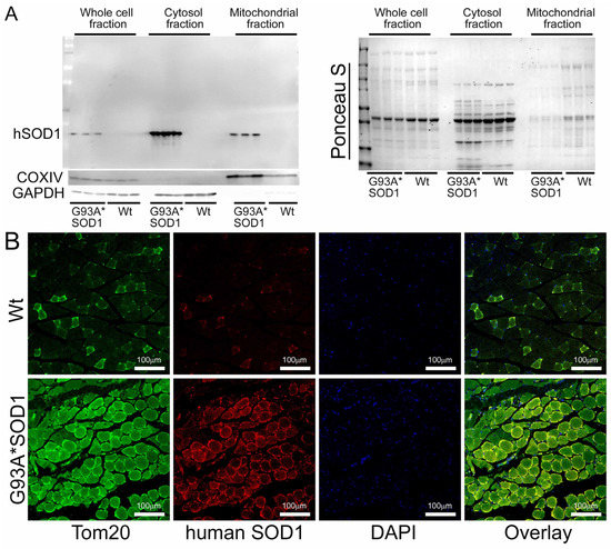 Mutant SOD1 mitochondrial localization in G93A*SOD1 skeletal muscles. (A) Western blot images showing the presence and partitioning of mutant SOD1 in the mitochondrial compartment of Gastro muscle tissue subcellular fractions consisting of the whole cell, cytosol, and mitochondrial fractions. Cytosolic protein GAPDH and mitochondrial membrane protein COXIV were used to assess the successful enrichment of the cytosol and mitochondria fractions. (n = 3 mice/group). Ponceau S staining of the transfer membranes was used to confirm the approximately equal loading and transfer across the gel. (B) Representative microscopic images showing anti-human SOD1 (red) and anti-Tom 20 (green) co-immunostaining in Gastro muscles. Scale bars: 100 µm. Wt = Wildtype.
