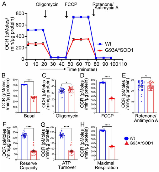 Earlier studies reported defective mitochondrial respiration on the liver, brain, and spinal cord mitochondria of G93A*SOD1 mice using Clark-type electrode oxygraph [30]. For the mitochondrial functional and biochemical experiments, we used the Gastro muscle due to the larger size of the muscle. Real-time oxygen consumption rates (OCRs) in isolated mitochondria show a lower respiratory profile in the G93A*SOD1 muscle compared to the Wt muscle (Figure 11A). Basal respiration was significantly decreased in the G93A*SOD1 mitochondria indicating lower respiratory function compared to the Wt muscle (Figure 11B). The addition of oligomycin leads to a decrease in basal respiration, which indicates that oxygen consumption used to generate ATP was significantly increased in the G93A*SOD1 mitochondria (Figure 11C). The measurement of maximal OCR obtained by carbonyl cyanide-p-trifluoromethoxy-phenylhydrazone (FCCP) addition also showed a significant decrease in G93A*SOD1 mitochondria (Figure 11D). The non-mitochondrial OCR estimated by the addition of rotenone and antimycin A showed similar values in both G93A*SOD1 and Wt mitochondria (Figure 11E). Quantification of the respiratory reserve capacity (Figure 11F) and ATP turnover (Figure 11G) showed significantly decreased OCR values in G93A*SOD1 mitochondria. Finally, the quantified maximum respiration was also significantly lower in G93A*SOD1 mitochondria (Figure 11H). All these OCR data together suggested that mitochondria isolated from G93A*SOD1 muscle were functionally compromised.