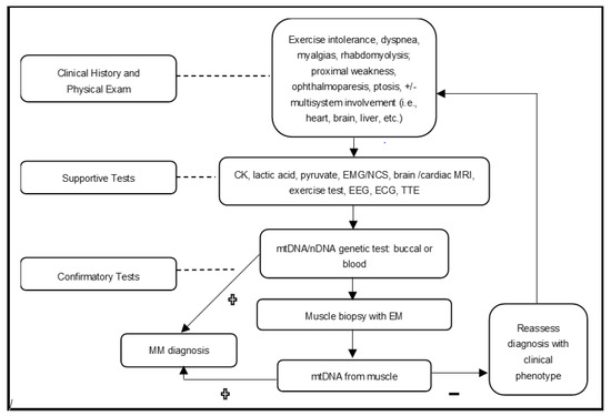 Diagnosing mitochondrial myopathies should involve a systematic approach, ultimately seeking a molecular etiology [6,8]. Every work-up should be carefully tailored to each individual presenting with PMM features to ensure an accurate diagnosis. Figure 1 below shows the authors’ approach, which can be used to efficiently evaluate a patient with a suspected mitochondrial myopathy.