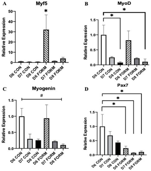 For each figure (n = 5), the symbol (*) is used to represent a significance difference between conditions and the symbol (#) is used to represent an overall significant effect for the ANOVA, with no significant differences between conditions. Myf5 (A): D6 FORM was increased compared to all other conditions (p < 0.05). MyoD (B): D8 CON was decreased compared to D6 CON (p = 0.025); D8 FORM was decreased compared to D6 CON (p = 0.032). Myogenin (C): There was an overall significant effect observed (p = 0.048; F = 2.775). Pax7 (D): D6 FORM was decreased compared to D6 CON (p = 0.044); D7 FORM was decreased compared to D6 CON (p = 0.008); D8 FORM was decreased compared to D6 CON (p = 0.011).