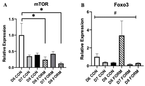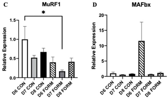 For each figure (n = 5), the symbol (*) is used to represent a significant difference between conditions and the symbol (#) is used to represent an overall significant effect for the ANOVA, with no significant differences between conditions. mTOR (A): D6 FORM was decreased compared to D6 CON (p = 0.015); D8 FORM was decreased compared to D6 CON (p = 0.004). Foxo3 (B): There was an overall significant effect observed (p = 0.006; F = 4.397). MuRF1 (C): D7 FORM was decreased compared to D6 CON (p = 0.029). MAFbx (D): There were no changes in expression between conditions.