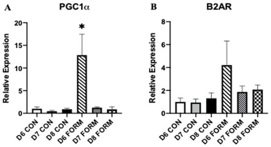 For each figure (n = 5), the symbol (*) is used to represent a significant difference between conditions. PGC-1α (A): D6 FORM was increased compared to all other conditions (p < 0.05). B2AR (B): There were no changes in expression between conditions.