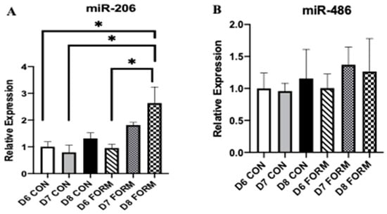 For each figure (n = 5), the symbol (*) is used to represent a significance difference between conditions. miR-206 (A): D8 FORM was increased compared to D6 CON (p = 0.011); D8 FORM was increased compared to D7 CON (p = 0.003); D8 FORM was increased compared to D6 FORM (p = 0.009). miR-486 (B): There were no changes in expression between conditions.