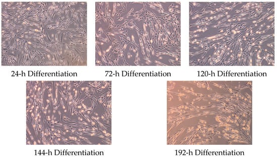 Primary human skeletal muscle myoblasts obtained from healthy adult donors (HSkMC 150-05A, passage 4-6; Sigma-Aldrich, St. Louis, MO, USA) were cultured in 35 mm 6-well collagen coated plates (Gibco, New York, NY, USA) at 37 °C in 5% CO2 in skeletal muscle cell growth media (151-500 Sigma-Aldrich). Myoblasts (n = 5) were seeded at a density of 80,000 cells per well. At confluency (80–90%), differentiation medium (151D-250 Sigma-Aldrich) was used to initiate myotube formation. Differentiation media was replaced every 48 h, and differentiation was achieved within ~6 days. Images representing progressive stages of myoblast differentiation are shown in Figure 5.