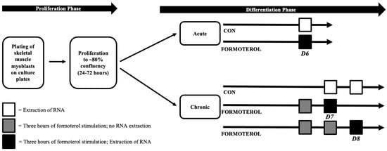 Three experimental conditions were utilized in this study: (a) control (CON), (b) acute formoterol stimulation (AFS), and (c) consecutive days of formoterol stimulation (CFS). For AFS, mature myotubes were treated with 30 nM of formoterol for three hours on day 6 of differentiation (D6), and this was immediately followed by RNA extraction. Similarly, for CFS, mature myotubes were treated with 30 nM of formoterol for three hours on two (D7) or three consecutive days (D8). RNA was extracted immediately following the final three-hour formoterol treatment for D7 and D8. On days in which D7 and D8 received formoterol, but RNA was not extracted, formoterol media was removed, culture wells were washed with PBS (Gibo, New York, NY, USA), and fresh differentiation media was added. Respective CON conditions (D6 CON, D7 CON, D8 CON) for each treatment condition were also included to make comparisons between AFS and CFS. Figure 6 provides an overview of the methodology used in this study.