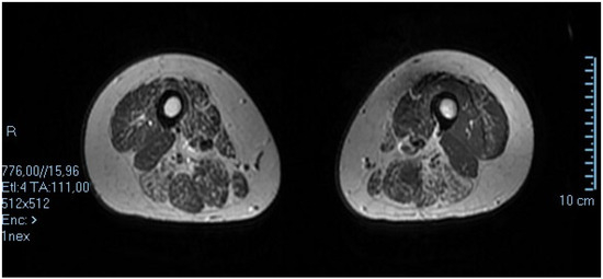 At age 35 a muscle MRI was performed (Figure 3) with a 1.5 Tesla Siemens Apparatus and analysis of DNA showed a normal Fukutin related protein (FRKP) gene, but a variant was traced in the LDB3 gene. Mutation in the LDB3 gene can be associated with cardiomyopathy, dilated, with or without left ventricular noncompaction myopathy, myofibrillar myopathy, and familial isolated dilated cardiomyopathy, and late-onset distal myopathy.