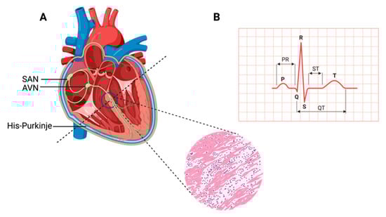 The heart, a muscular organ, orchestrates blood circulation throughout the body by generating and coordinating electrical impulses. These impulses are controlled by the cardiac conduction system (CCS), which consists of myogenic components that regulate the contractions of the atria and ventricles [1,2,3,4]. In higher vertebrates, the CCS is divided into specific regions: the slow-conducting structures, such as the sinoatrial node (SAN); the primary site for pacemaker cardiomyocytes (CMs), often referred to as the “natural pacemakers” of the heart, which are located between the superior vena cava and the right atrium; the secondary pacemaker, the atrioventricular node (AVN), which is situated within the atrioventricular septum; and the fast-conducting ventricular conducting system (VCS), which includes the atrioventricular bundle (AVB, also known as the His-Bundle), the right and left bundle branches (BBs), and the Purkinje fiber network (PFN) (which is responsible for ventricular coordination) [3,5,6]. Pacemaker cells within the CCS are a specialized population with a unique and vital role. They have the remarkable capability to spontaneously generate regular electrical impulses, effectively setting the pace for the entire heart. These rhythmic depolarization and repolarization cycles in pacemaker cells are responsible for initiating each heartbeat and maintaining its regularity [4]. These electrical signals rapidly travel through the atrial cardiomyocytes, thus initiating atrial contraction [7]. Subsequently, they navigate through slower-conducting tissues within the AVN, introducing a deliberate delay before transmitting to the His-Purkinje fibers, thereby effectively coordinating ventricular contraction [4,8] (Figure 1).