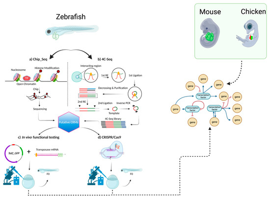 The proposed methodology for further investigating CCS-specific enhancers that will lead to building an informative GRN. Schematic of methods that can be used to identify cis-regulatory modules (CRMs) that use isolated hearts of various key developmental models (zebrafish, mice, or chicken). For each model, in this case zebrafish is shown, various chromatin capture methods like ChIP-Seq or 4C-Seq can be employed to obtain a list of putative CRMs. These CRMs can be functionally tested and investigated further using genome-editing techniques like CRISPR/Cas9. A functionally validated GRN can then be generated by intersecting data obtained from several developmental models.