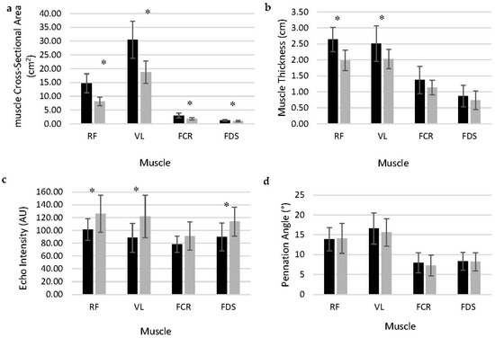 Muscle characteristics of males (black) and females (grey) for (a) mCSA, (b) mT, (c) EI, and (d) PA. mCSA: muscle cross-sectional area; mT: muscle thickness; EI: echo intensity; PA: pennation angle; RF: rectus femoris; VL: vastus lateralis; FCR: flexor carpi radialis; FDS: flexor digitorum superficialis. * Indicates significant difference between sex.