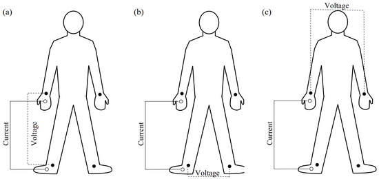 Bioelectrical impedance analysis electrode configuration for: (a) total body, (b) legs only, and (c) arms only.