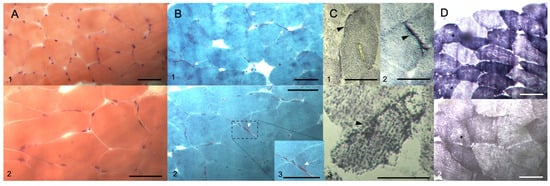 Deltoid muscle biopsy study. (A) Hematoxylin and Eosin-stained tissue section disclosed mild variation in muscle fiber caliber and no detectable abnormalities in the conjunctive tissue. (B) Modified Gömöri trichrome stain disclosed mild subsarcolemmal mitochondrial proliferation (white arrows; 1, 2, 3). (C) Succinate dehydrogenase (SDH) stain showed several foci of subsarcolemmal mitochondrial proliferation (black arrowheads; 1, 2, 3). (D) Nicotinamide adenine dinucleotide tetrazolium reductase (NADH-TR) staining disclosed areas of scattered moth-eaten appearance in muscle fibers (black asterisks; 1, 2). Size scale bars (A–D): 50 μm.