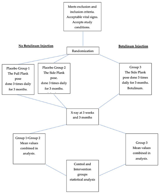 Of note is the insignificance of the 3-week vs. 3-month values’ changes in the placebo groups (1 and 2), suggesting that the effect of the botulinum toxin type A injections was a significant factor in the patients’ recoveries. See Table 2 and Table 3. In studies showing the efficacy of the yoga pose alone, 5–12-month inter-X-ray periods were used [27,28,29].