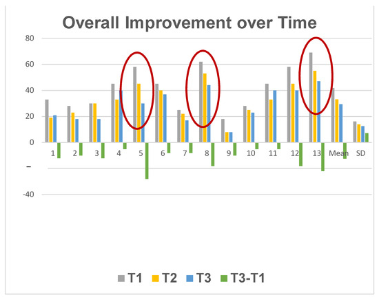 Figure 3. Individual patients’ course in the three months following inception of the side plank and incobotulinum injection. T1 = Cobb angle at time of injection. T2 = Cobb angle 3 weeks post-injection. T3 = Cobb angle 3 months post-injection. Cases showing greatest improvement are encircled.