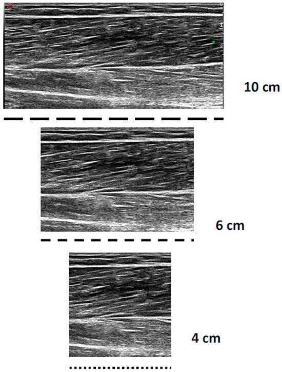 All the sonograms were analysed offline with Image J version 1.52 software (Wayne Rasband National Institute of Health, Bethesda, MD, USA). All the images were calibrated to the known length of the FOV (10 cm); then, for the 4 and 6 cm digitization, all images were cropped by 6 and 4 cm, 50% from the distal and proximal portions, respectively, to maintain an image of the muscle belly (Figure 1). For each image (4, 6, and 10 cm), a fascicle of interest was identified, where the MT, PA, AA, and observed FL were measured three times within each image, to enable complete FL estimation. The 4 and 6 cm FOV were chosen, as these shorter FOVs are the most frequently used within the literature [6,7,9,10,11,12]. Three trigonometric linear equations were utilised within the present study: