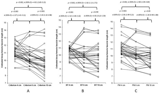 The data were found to be non-normally distributed (p < 0.05), hence the use of a non-parametric statistical approach, which determined very high and nearly perfect acceptable within-session reliability for all methods of estimation for the 4, 6, and 10 cm FOV methods (Table 1). The results of Freidman’s test revealed a significant mains effect (p < 0.001), with the results of the Durbin–Conover pairwise comparisons highlighting significant moderate to very large differences between the FOVs for all estimation methods (Figure 2). The Durbin–Conover pairwise comparisons between estimation equations can found in the Appendix A. Between the images (4 cm, 6 cm, and 10 cm), significant (p < 0.001) large to very large associations were observed, with 46–79% of the estimated FL using the criterion equation being able to explain each measure, 29–78% of the estimated FL using the basic trigonometry equation being able to explain each measure, and 49–76% of the estimated FL using the basic trigonometry equation being able to explain each measure (Figure A1).