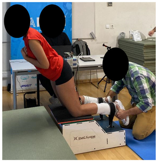 Participants were evaluated in the NHE in three different lower leg positions: neutral, maximal internal rotation, and maximal external rotation (Figure 2). These exercises were conducted on the EMG device (25 cm above ground), allowing for controlled and standardized execution. The exercise execution followed established guidelines, with participants positioned accordingly [35,36]. The participants start in a kneeling position, with the torso from the knees upward held rigid and straight. Furthermore, the knees were aligned with the pelvis, trunk, shoulder, neck, and head, with shoulder-width spacing. A rigid belt was positioned in the intermalleolar area to stabilize the lower limb and prevent unnecessary movements. The feet had no interaction with the device (contact free), remaining in a neutral position in all tests. It was suggested for participants to keep their hands facing forward and their elbows pointing down, ready to buffer the fall, during all the test’s executions.