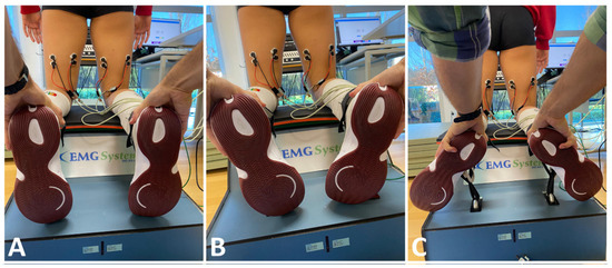Different leg positions tests. (A)—Neutral; (B)—Maximum internal rotation; (C)—Maximum external rotation.