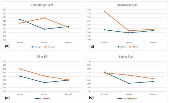 Nevertheless, small effect sizes (η2 = 0.01 to 0.03) were found between positions in BF left, BF Right, ST Right, BF (Right + Left), and Left side (BF + ST). No effects were found for ST Left, ST (Right + Left), or Right side (BF + ST). The Internal position generally showed the highest activations (227.84 to 203.38), except for BF Right (Neutral—219.14 ± 57.49). The largest mean differences were most frequently between the Internal and Neutral positions (BF Right—25.86; Left-side—14.93; ST Right—13.26; ST (Left + Right)—8.64; ST Left—4.01), followed by differences between the Internal and External positions (BF (Left + Right)—14.69; Right-side—7.65), and between the Neutral and External positions (BF Right—12.53).