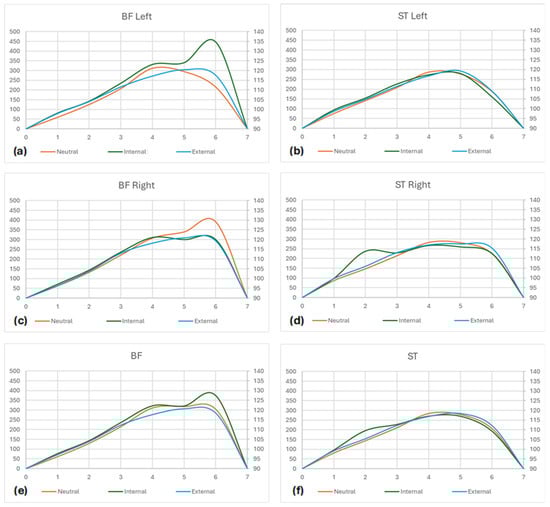 Activity curves (EMG × Time × Range of Motion). (a) Neutral, Internal, and External curves for the Biceps Femoris muscle of the left thigh; (b) Neutral, Internal, and External curves for the Semitendinosus muscle of the left thigh; (c) Neutral, Internal, and External curves for the Biceps Femoris muscle of the right thigh; (d) Neutral, Internal, and External curves for the Semitendinosus muscle of the right thigh; (e) Neutral, Internal, and External curves for the Biceps Femoris muscles of both sides; (f) Neutral, Internal, and External curves for the Semitendinosus muscles of both sides; (g) Neutral, Internal, and External curves for the Biceps Femoris and Semitendinosus muscles of the left thigh; (h) Neutral, Internal, and External curves for the Biceps Femoris and Semitendinosus muscles of the right thigh.