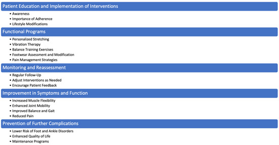 The interventions elucidated in this manuscript present promising avenues for addressing muscle-related foot and ankle issues. Figure 2 provides a synthesis of the main intervention points to be addressed in these situations. This includes insights from both foundational texts and recent studies. Foundational texts have provided the theoretical underpinnings and historical perspectives necessary for understanding the pathophysiology of MGSCs and the general principles of rehabilitation nursing. For example, foundational works such as those reviewed early in our methodology were crucial in establishing the basic concepts of gastrocnemius contractures and their impact on foot and ankle biomechanics. Recent studies, such as those included in our results section [19,20,21,22], have built on this foundation by exploring specific interventions like vibration therapy and surgical techniques, providing up-to-date evidence on their effectiveness and clinical application.
