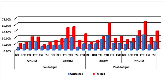 Comparison of muscle activation (RMS (%)) between 50%RM and 70%RM sets in pre-fatigue and post-fatigue situations in untrained and trained subjects. BFL: biceps femoris left; BFR: biceps femoris right; TTL: trapezius transversalis left; TTR: trapezius transversalis right; ESL: erector spinae longissimus left; ESR: erector spinae longissimus right.