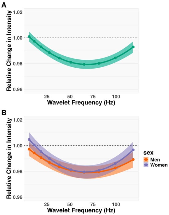 Relative change in spectral intensity plotted as a function of trial duration. The relationship is illustrated using model-predicted slopes (dots) and 95% confidence intervals (ribbons). To illustrate a null-effect while on the relative scale, a dashed line is presented at 1 on the y-intercept to represent 0 (i.e., no change in the relative scale). Statistical analysis indicated there was no significant three-way interaction between sex, time, and wavelet. This null effect is visibly demonstrated in the bottom subfigure. There was, however, a significant two-way interaction between wavelet and time, illustrated by the top subfigure (A). Furthermore, there was a main effect of sex, which can be identified in the bottom subfigure (B).
