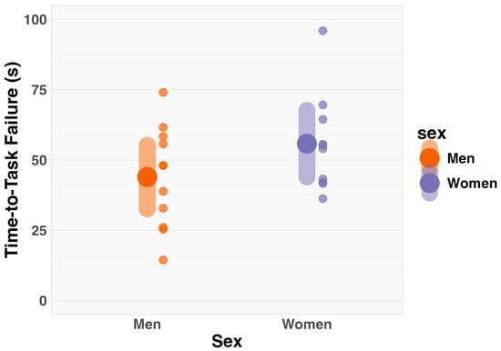 An independent sample t-test revealed no significant differences in time-to-task failure between men and women (MD = −11.87 s, CI95% = −28.25 to 4.51; t19 = −1.52, p = 0.15; Figure 3).