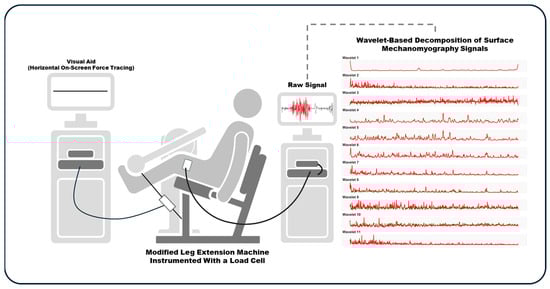 The changes in intensity within each wavelet domain were examined during a fatiguing, maximal, unilateral isometric leg extension in healthy, recreationally active men and women. Testing procedures involved performing isometric muscle actions on a modified leg extension machine (Body-Solid, GLCE365, Forest Park, IL, USA) equipped with a load cell (Honeywell Model 41 Precision Low Profile Load Cell, Charlotte, NC, USA). Neuromuscular responses were derived from sMMG signals recorded from the vastus lateralis of the non-dominant limb, with leg dominance determined based on participants’ kicking preference. The non-dominant leg was specifically selected for testing to standardize conditions across all participants, as it is typically less trained and less likely to have undergone specific conditioning compared to the dominant leg [43]. This approach was intended to minimize potential confounding factors related to prior training or habitual use.