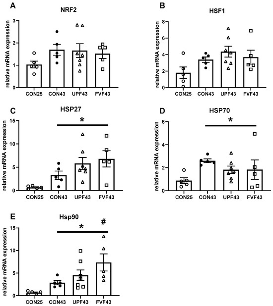 Effects of temperature and fucoidan species on mRNA expression in EDL muscles. Markers of oxidative-stress response (A,B), and heat-stress response (C–E). * p < 0.05 compared to CON25, # p < 0.05 compared to CON43; 1-way ANOVA with Šidāk multiple-comparisons analysis. N = 5 for CON25 (open circle), N = 5 for CON43 (closed circle), N = 7 for Undaria pinnatifida (UPF43, closed triangle), and N = 5 for Fucus vesiculosus (FVF43, open triangle). Data are presented as mean ± SEM.
