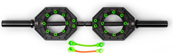 A model of the complete upper body bar (CUBB) device, where the handles are set at horizontal/neutral positions. The green band was used in this study (a courtesy picture from Resistance in Rotation Corporation, Peru, IN, USA).