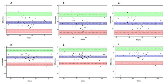 Bland–Altman plots. (A) OB1 vs. AV1; (B) OB2 vs. AV1; (C) OB3 vs. AV1; (D) OB1 vs. AV2; (E) OB2 vs. AV2; (F) OB3 vs. AV2.