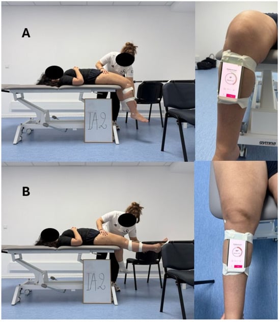 The assessment was always carried out on the right lower limb to make all the assessment procedures and methods uniform. The use of the same lower limb for assessment was also to reduce variability regarding natural differences between limbs, as well as dominance, which could influence ROM. Before starting the assessment, the participants were asked to position themselves in a supine position near the edge of the table with their thighs resting on the surface and the edge of the table touching the popliteal fossa, leaving their knees bent at around 90°. Marks were then placed on the following anatomical points: greater trochanter, femoral lateral condyle, and lateral malleolus. The marks used were circular adhesive surfaces 1.5 cm in diameter, identical to those used in other studies [13]. These marks were placed while the participant was already lying on the couch to reduce the risk of sliding on the skin. For better positioning of the marks, participants were asked to wear shorts so that the anatomical points were more visible, and the adhesive marks were placed directly on the skin. In front of the participant, perpendicular to the edge of the table and at the same height, a horizontal bar was placed about 40 cm away in order to reduce the influence of the participant’s subjective sensation of hamstring stretching [26,45]. After placing the adhesive marks, the reference for placing the upper part of the smartphone on the lower limb was marked, five centimeters below the tuberosity of the tibia. This reference was marked on the participant’s skin. The smartphone was taped to the lower limb to ensure that there were no accessory movements that could give false measurements. When all the previous steps were completed, the evaluator pressed the “START” button on the app to calibrate, considering 90° of knee flexion as the starting position (0°). Then, the evaluator supported the lower limb so that the markers were not covered, performed passive knee extension until it touched the horizontal bar, pressed the “STOP” button, and recorded the measurement. The previous methodological procedures are exemplified in Figure 2.