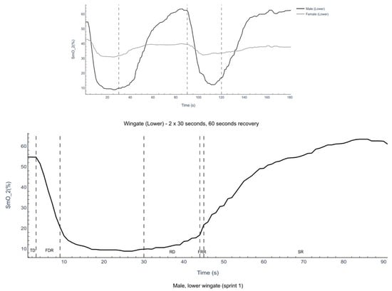 Muscle oxygenation across Wingate-based sprints for males and females. TD = time delay, FRD = fast desaturation rate, SS = steady state RD resaturation delay, FRR = fast resaturation rate, SR = slow recovery. The dotted line reflects the time band for each segment described.