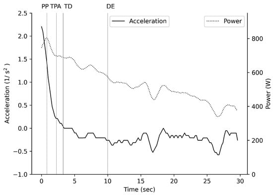 Acceleration and Power across a Wingate-based sprint. PP peak power; TPA time of positive acceleration, TD time delay; DE end fast desaturation.