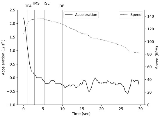 Acceleration and speed across a Wingate-based sprint. TPA time of positive acceleration; TMS time to maximum speed; TSL time to speed loss; DE end fast desaturation.