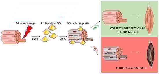 Illustration of the muscle regeneration process that occurs after an injury in healthy muscle compared with ALS muscle. The image was produced using adapted templates obtained from Servier Medical Art (licensed under Creative Commons Attribution 3.0 Unported), ensuring proper attribution in accordance with the license terms. (https://smart.servier.com, accessed on 24 May 2025).